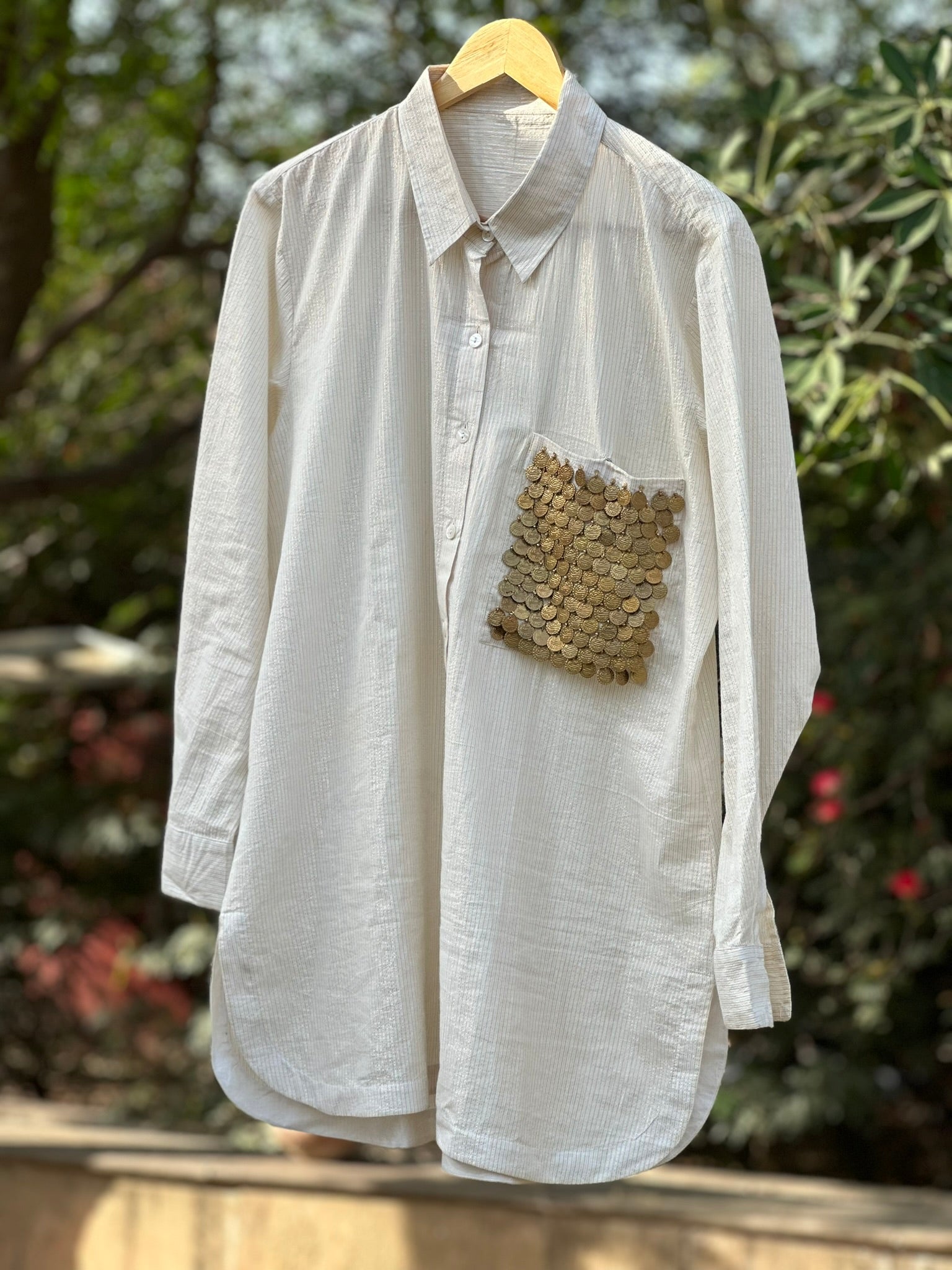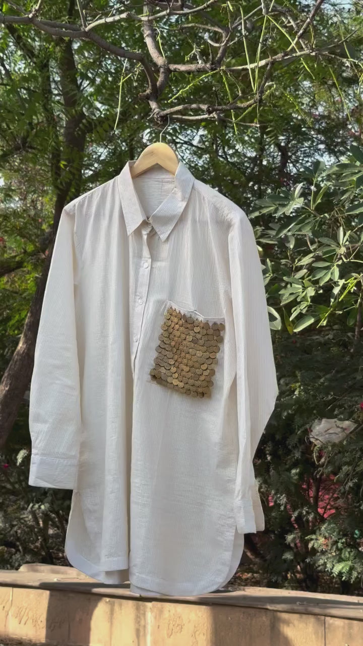 • Feature: Front pocket with antique coin embellishments